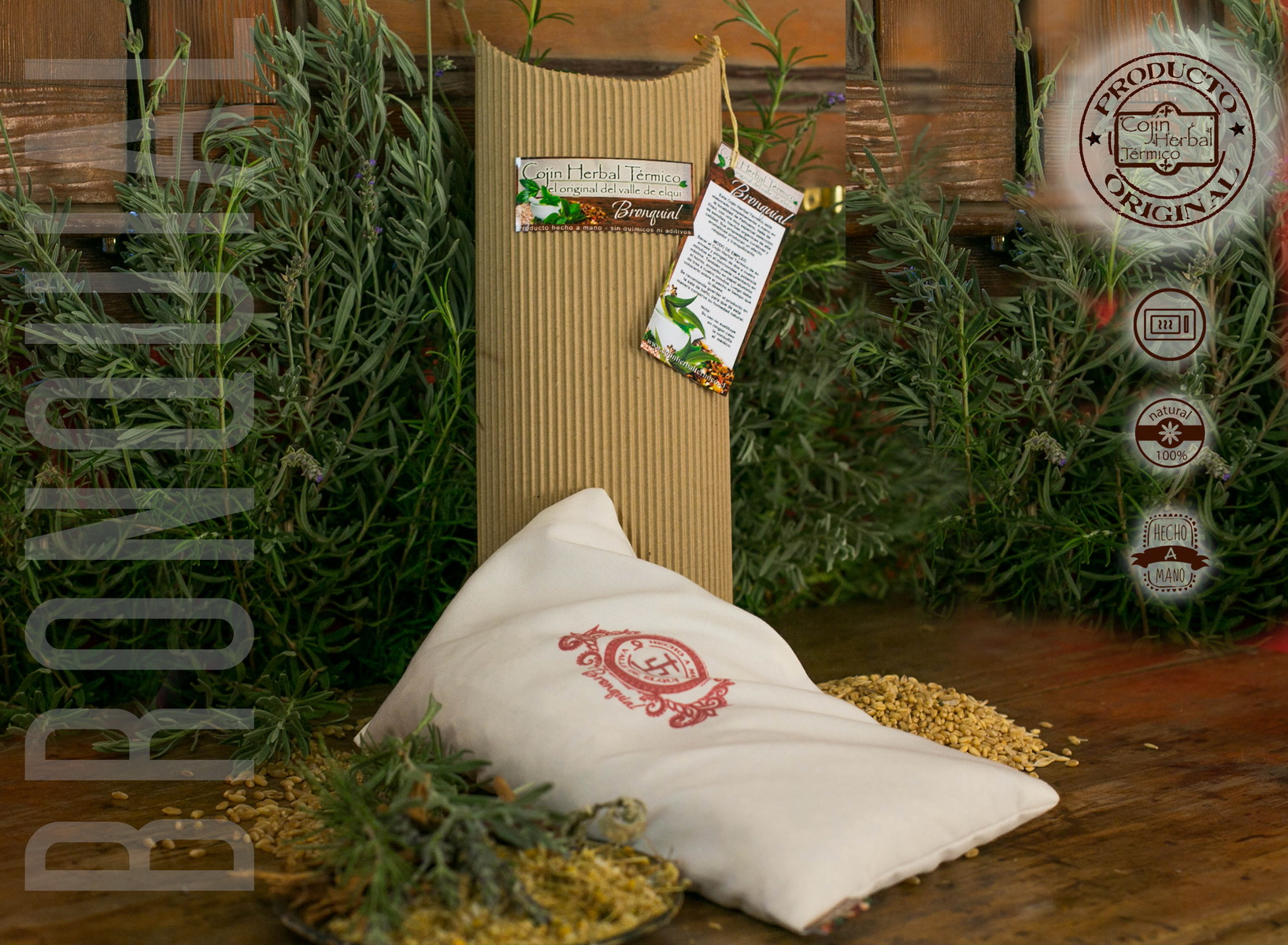 MODO DE USO: Introducir el Cojín Herbal Térmico ”BRONQUITIS” en el microondas de tres a cuatro minutos a potencia máxima; o en el horno convencional, en este caso envuelto en papel aluminio (Alusa Foil) por cuatro a cinco minutos. Luego debe colocarlo sobre el pecho el tiempo que desee. Se recomienda guardar el Cojín en la sala de baño, para que de esta manera conserve su humedad natural.